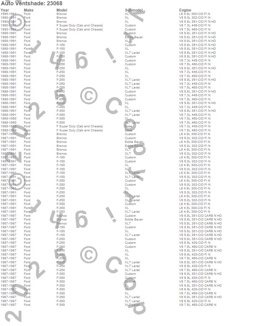 Below is an abbreviated list of applications for the Bugflector Stone/Bug Deflector.Bronco, F Super Duty, F-150, F-250, F-350, Ford, 1991, 1990, 1989, 1988, 1987