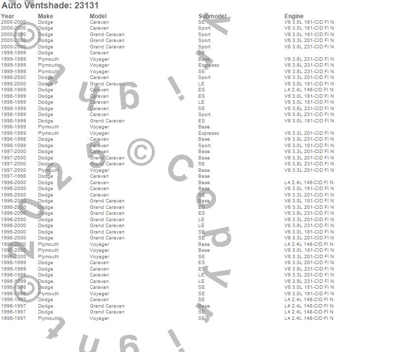 Below is an abbreviated list of applications for the Bugflector Stone/Bug Deflector.Caravan, Grand Caravan, Voyager, Dodge, Plymouth, 2000, 1999, 1998, 1997, 1996