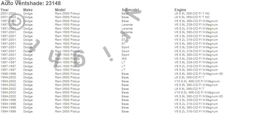 Below is an abbreviated list of applications for the Bugflector Stone/Bug Deflector.Ram 1500, Ram 2500, Ram 3500, Dodge, 2002, 2001, 2000, 1999, 1998, 1997, 1996, 1995, 1994