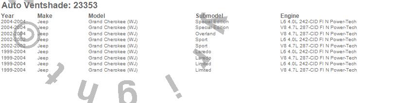 Below is an abbreviated list of applications for the Bugflector Stone/Bug Deflector.Grand Cherokee (WJ), Jeep, 2004, 2003, 2002, 2001, 2000, 1999