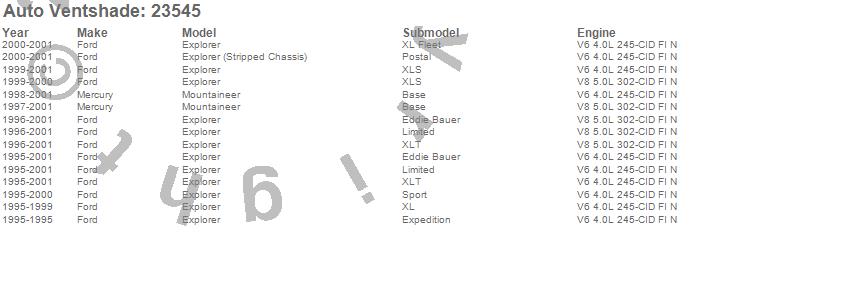Below is an abbreviated list of applications for the Bugflector Stone/Bug Deflector.Explorer, Explorer (Stripped Chassis), Mountaineer, Ford, Mercury, 2001, 2000, 1999, 1998, 1997, 1996, 1995
