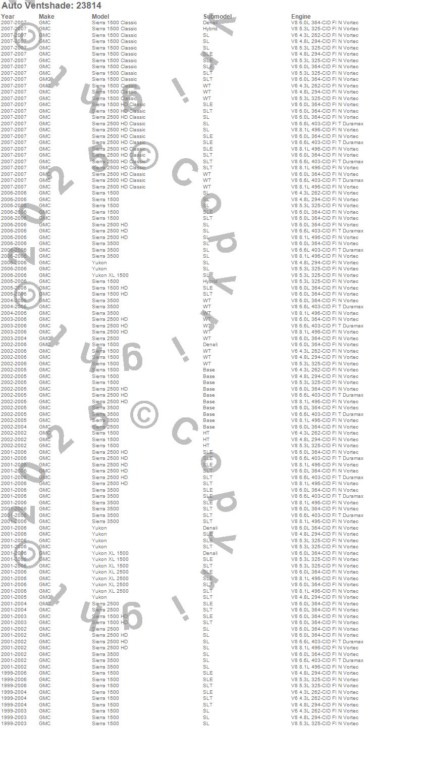 Below is an abbreviated list of applications for the Bugflector Stone/Bug Deflector.Sierra 1500, Sierra 1500 Classic, Sierra 1500 HD, Sierra 1500 HD Classic, Sierra 2500, Sierra 2500 HD, Sierra 2500 HD Classic, Sierra 3500, Yukon, Yukon XL 1500, Yukon XL 2500, GMC, 2007, 2006, 2005, 2004, 2003, 2002, 2001, 2000