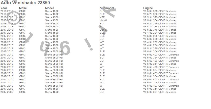 Below is an abbreviated list of applications for the Bugflector Stone/Bug Deflector.Sierra 1500, Sierra 2500 HD, Sierra 3500 HD, GMC, 2013, 2012, 2011, 2010, 2009, 2008, 2007