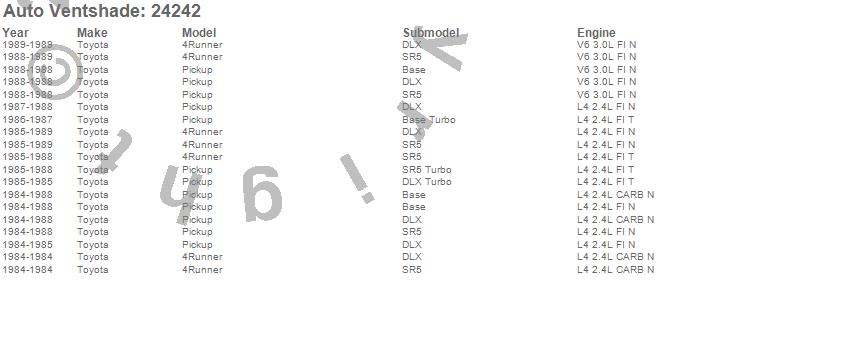 Below is an abbreviated list of applications for the Bugflector II Stone/Bug Deflector.4Runner, Pickup, Toyota, 1989, 1988, 1987, 1986, 1985, 1984