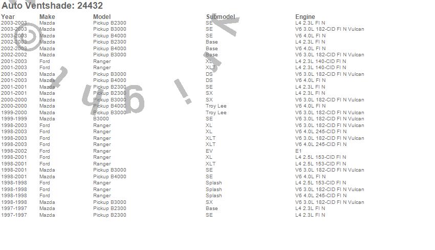 Below is an abbreviated list of applications for the Bugflector II Stone/Bug Deflector.B2300, B3000, B4000, Ranger, Ford, Mazda, 2003, 2002, 2001, 2000, 1999, 1998, 1997