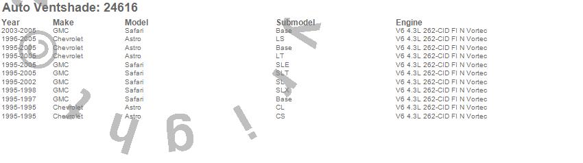 Below is an abbreviated list of applications for the Bugflector II Stone/Bug Deflector.Astro, Safari, Chevrolet, GMC, 2005, 2004, 2003, 2002, 2001, 2000, 1999, 1998, 1997, 1996, 1995