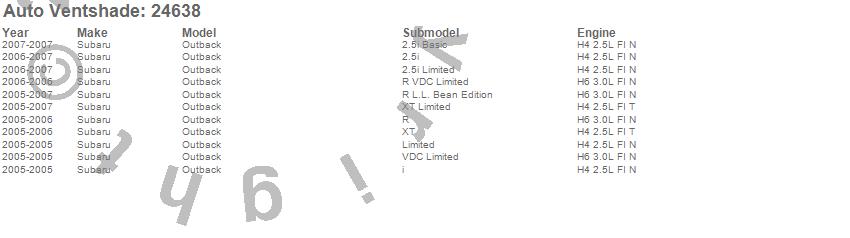 Below is an abbreviated list of applications for the Bugflector II Stone/Bug Deflector.Outback, Subaru, 2007, 2006, 2005
