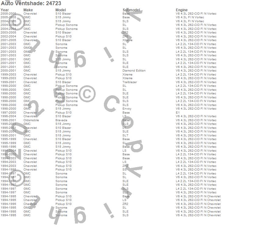 Below is an abbreviated list of applications for the Bugflector II Stone/Bug Deflector.Bravada, S10 Blazer, S10 Pickup, S15 Jimmy, Sonoma, Chevrolet, GMC, Oldsmobile, 2005, 2004, 2003, 2002, 2001, 2000, 1999, 1998, 1997, 1996, 1995, 1994