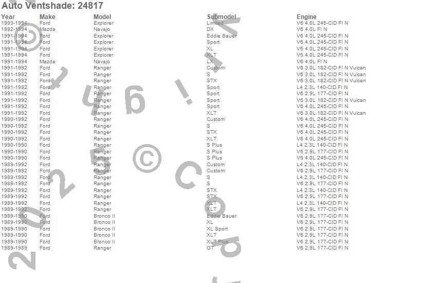 Below is an abbreviated list of applications for the Bugflector II Stone/Bug Deflector.Bronco II, Explorer, Navajo, Ranger, Ford, Mazda, 1994, 1993, 1992, 1991, 1990, 1989