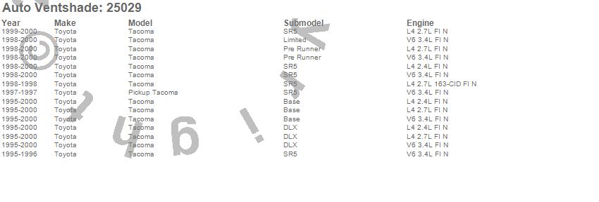 Below is an abbreviated list of applications for the Bugflector II Stone/Bug Deflector.Tacoma, Toyota, 2000, 1999, 1998, 1997, 1996, 1995