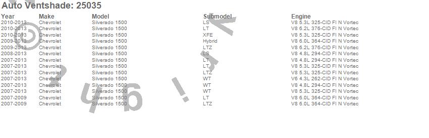 Below is an abbreviated list of applications for the Bugflector II Stone/Bug Deflector.Silverado 1500, Chevrolet, 2013, 2012, 2011, 2010, 2009, 2008, 2007