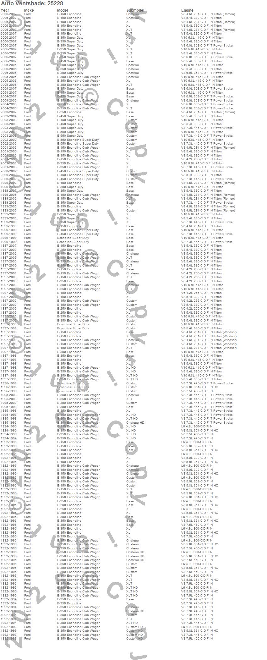 Below is an abbreviated list of applications for the Bugflector II Stone/Bug Deflector.E-150 Econoline, E-150 Econoline Club Wagon, E-250 Econoline, E-350 Econoline, E-350 Econoline Club Wagon, E-350 Super Duty, E-450 Econoline Super Duty, E-450 Super Duty, E-550 Econoline Super Duty, E-550 Super Duty, Econoline Super Duty, Ford, 2007, 2006, 2005, 2004, 2003, 2002, 2001, 2000
