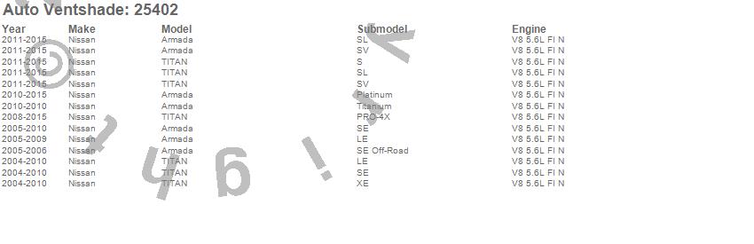 Below is an abbreviated list of applications for the Bugflector II Stone/Bug Deflector.Armada, TITAN, Nissan, 2015, 2014, 2013, 2012, 2011, 2010, 2009, 2008, 2007, 2006, 2005, 2004