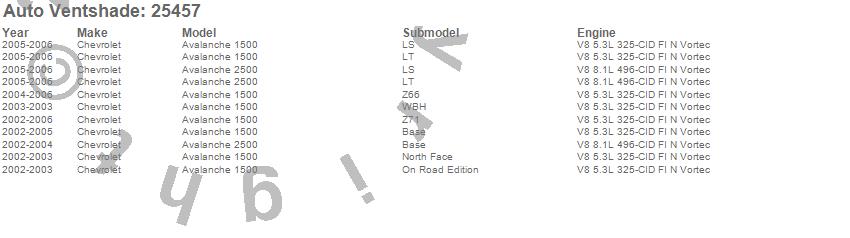 Below is an abbreviated list of applications for the Bugflector II Stone/Bug Deflector.Avalanche 1500, Avalanche 2500, Chevrolet, 2006, 2005, 2004, 2003, 2002