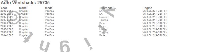 Below is an abbreviated list of applications for the Bugflector II Stone/Bug Deflector.Pacifica, Chrysler, 2008, 2007, 2006, 2005, 2004