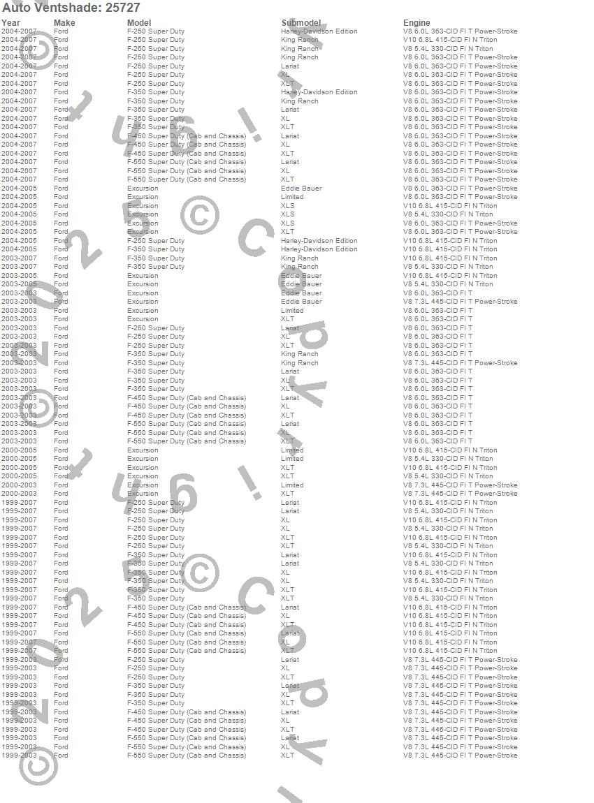 Below is an abbreviated list of applications for the Bugflector Stone/Bug Deflector.Excursion, F-250 Super Duty, F-350 Super Duty, F-450 Super Duty, F-550 Super Duty, Ford, 2007, 2006, 2005, 2004, 2003, 2002, 2001, 2000, 1999