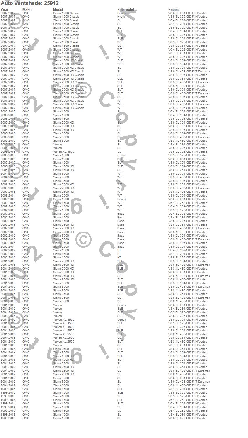 Below is an abbreviated list of applications for the Bugflector II Stone/Bug Deflector.Sierra 1500, Sierra 1500 Classic, Sierra 1500 HD, Sierra 1500 HD Classic, Sierra 2500, Sierra 2500 HD, Sierra 2500 HD Classic, Sierra 3500, Yukon, Yukon XL 1500, Yukon XL 2500, GMC, 2007, 2006, 2005, 2004, 2003, 2002, 2001, 2000