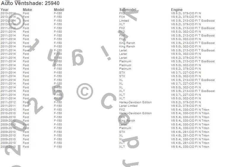 Below is an abbreviated list of applications for the Bugflector II Stone/Bug Deflector.F-150, Ford, 2014, 2013, 2012, 2011, 2010, 2009