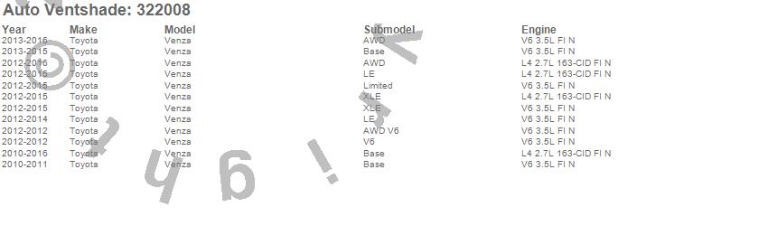 Below is an abbreviated list of applications for the Aeroskin Smoke Hood Protector.Venza, Toyota, 2016, 2015, 2014, 2013, 2012, 2011, 2010
