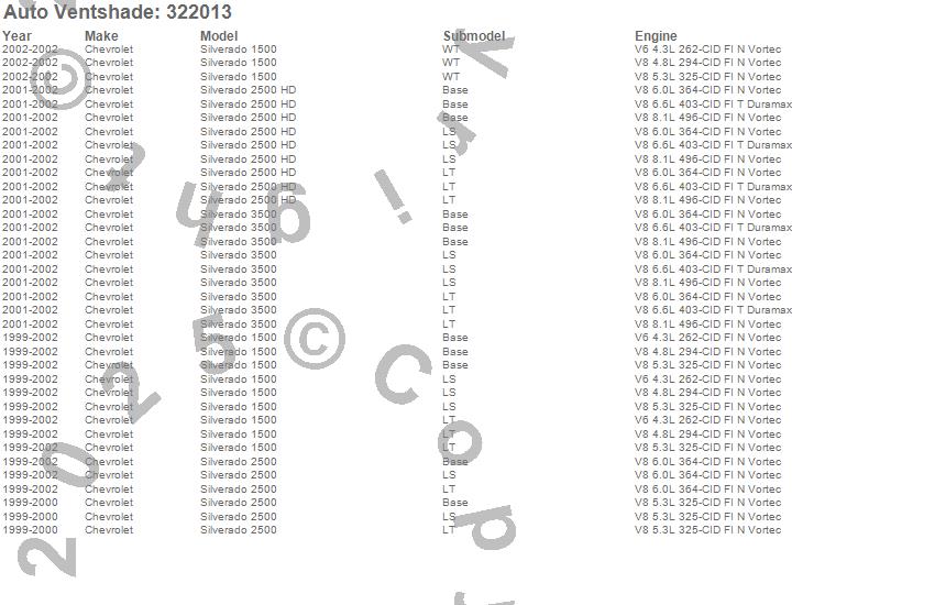 Below is an abbreviated list of applications for the Aeroskin Smoke Hood Protector.Silverado 1500, Silverado 2500, Silverado 2500 HD, Silverado 3500, Chevrolet, 2002, 2001, 2000, 1999