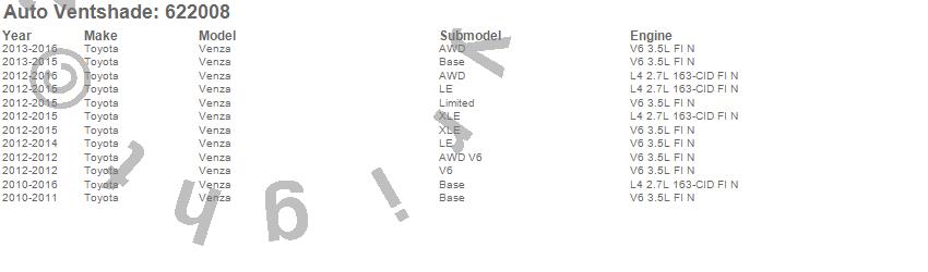 Below is an abbreviated list of applications for the Aeroskin Chrome Hood Protector.Venza, Toyota, 2016, 2015, 2014, 2013, 2012, 2011, 2010