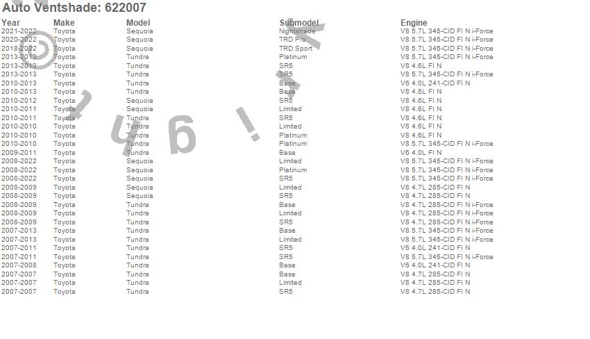 Below is an abbreviated list of applications for the Aeroskin Chrome Hood Protector.Sequoia, Tundra, Toyota, 2022, 2021, 2020, 2019, 2018, 2017, 2016, 2015, 2014, 2013, 2012, 2011, 2010, 2009, 2008, 2007