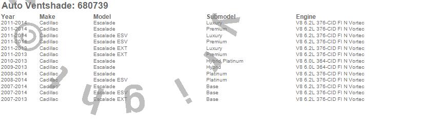 Below is an abbreviated list of applications for the Chrome Hood Shield.Escalade, Escalade ESV, Escalade EXT, Cadillac, 2014, 2013, 2012, 2011, 2010, 2009, 2008, 2007