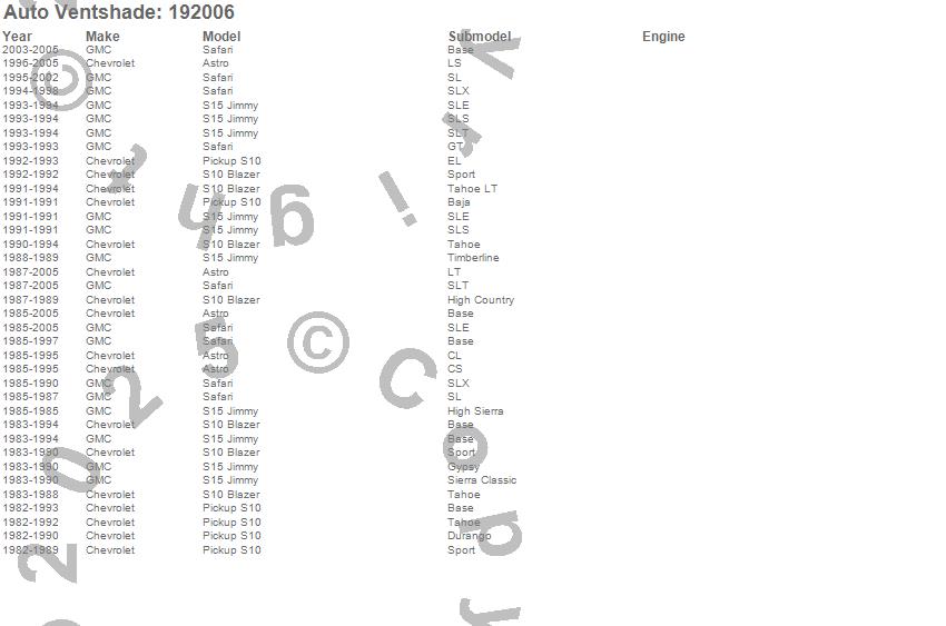 Below is an abbreviated list of applications for the Ventvisor In-Channel Deflector 2 pc..Astro, S10 Blazer, S10 Pickup, S15 Jimmy, Safari, Chevrolet, GMC, 2005, 2004, 2003, 2002, 2001, 2000, 1999, 1998, 1997, 1996, 1995, 1994, 1993