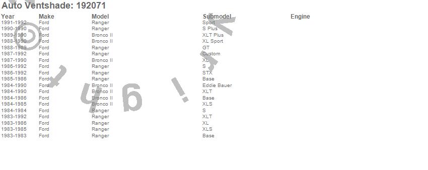Below is an abbreviated list of applications for the Ventvisor In-Channel Deflector 2 pc..Bronco II, Ranger, Ford, 1992, 1991, 1990, 1989, 1988, 1987, 1986, 1985, 1984, 1983