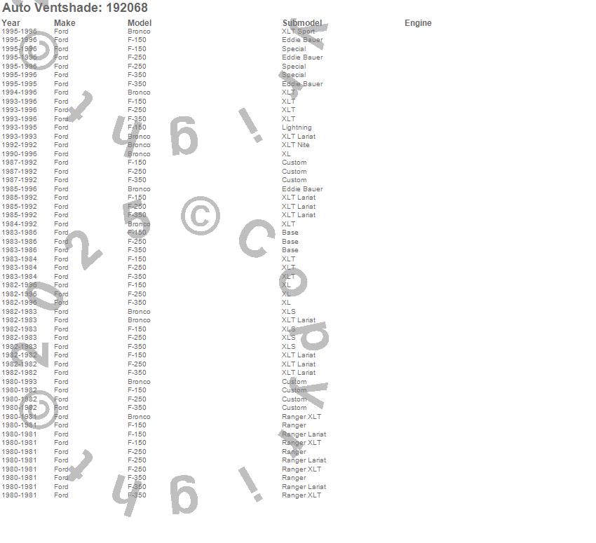 Below is an abbreviated list of applications for the Ventvisor In-Channel Deflector 2 pc..Bronco, F-150, F-250, F-350, Ford, 1996, 1995, 1994, 1993, 1992, 1991, 1990, 1989, 1988, 1987, 1986, 1985, 1984, 1983, 1982