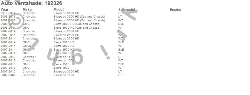 Below is an abbreviated list of applications for the Ventvisor In-Channel Deflector 2 pc..Sierra 1500, Sierra 2500 HD, Sierra 3500 HD, Silverado 1500, Silverado 2500 HD, Silverado 3500, Silverado 3500 HD, Chevrolet, GMC, 2014, 2013, 2012, 2011, 2010, 2009, 2008, 2007
