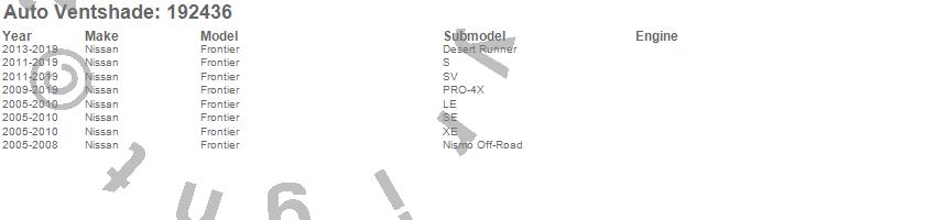 Below is an abbreviated list of applications for the Ventvisor In-Channel Deflector 2 pc..Frontier, Nissan, 2019, 2018, 2017, 2016, 2015, 2014, 2013, 2012, 2011, 2010, 2009, 2008, 2007, 2006, 2005