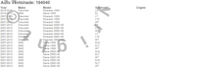 Below is an abbreviated list of applications for the Ventvisor In-Channel Deflector 4 pc..Sierra 1500, Sierra 2500 HD, Sierra 3500 HD, Silverado 1500, Silverado 2500 HD, Silverado 3500 HD, Chevrolet, GMC, 2013, 2012, 2011, 2010, 2009, 2008, 2007