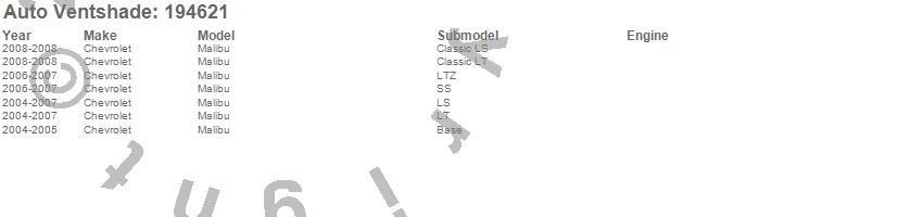 Below is an abbreviated list of applications for the Ventvisor In-Channel Deflector 4 pc..Malibu, Chevrolet, 2008, 2007, 2006, 2005, 2004