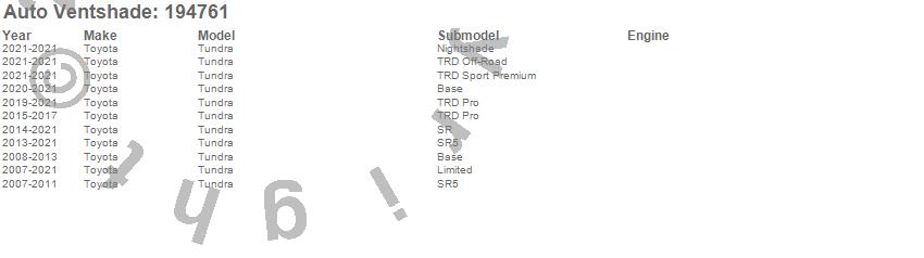 Below is an abbreviated list of applications for the Ventvisor In-Channel Deflector 4 pc..Tundra, Toyota, 2021, 2020, 2019, 2018, 2017, 2016, 2015, 2014, 2013, 2012, 2011, 2010, 2009, 2008, 2007