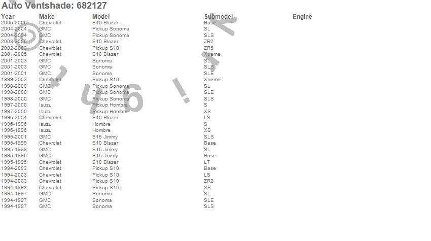 Below is an abbreviated list of applications for the Chrome Ventvisor Deflector 2 pc..Hombre, S10 Blazer, S10 Pickup, S15 Jimmy, Sonoma, Chevrolet, GMC, Isuzu, 2005, 2004, 2003, 2002, 2001, 2000, 1999, 1998, 1997, 1996, 1995, 1994
