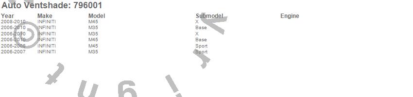 Below is an abbreviated list of applications for the Ventvisor Low Profile Deflector 6 pc..M35, M45, INFINITI, 2010, 2009, 2008, 2007, 2006