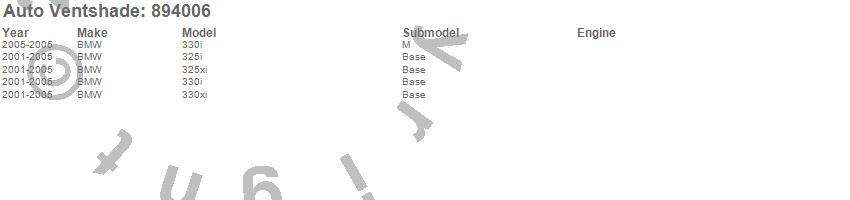 Below is an abbreviated list of applications for the Ventvisor Low Profile Deflector 4 pc..325i, 325xi, 330i, 330xi, BMW, 2005, 2004, 2003, 2002, 2001