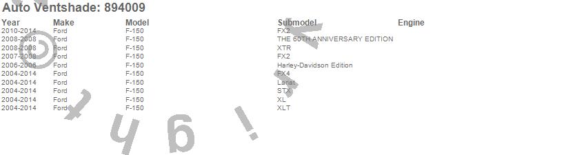 Below is an abbreviated list of applications for the Ventvisor Low Profile Deflector 4 pc..F-150, Ford, 2014, 2013, 2012, 2011, 2010, 2009, 2008, 2007, 2006, 2005, 2004