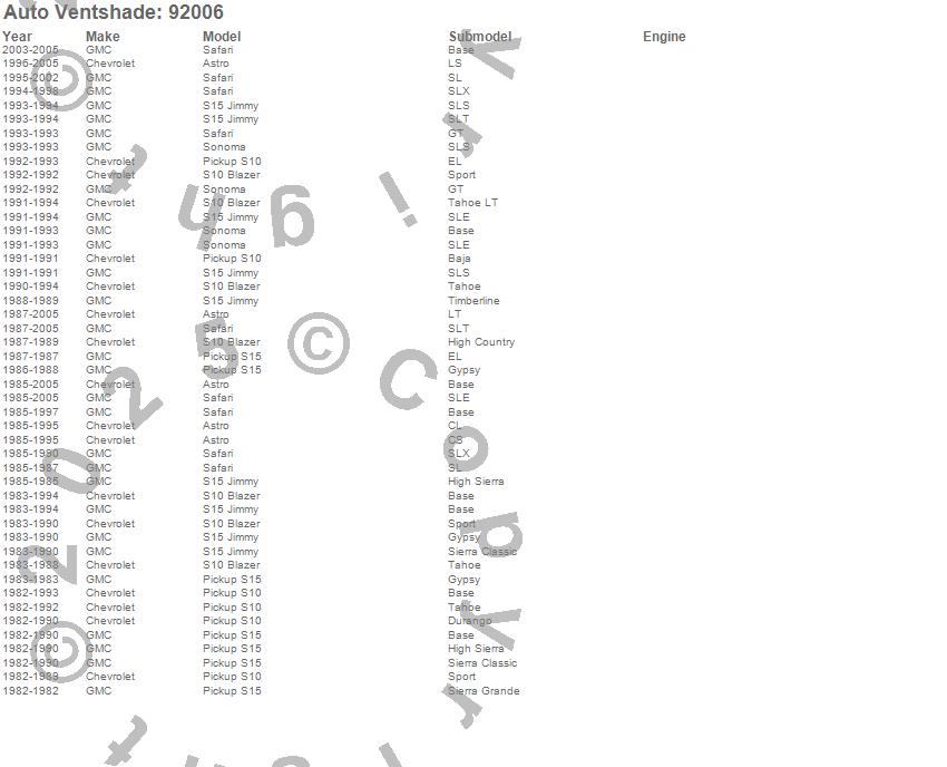 Below is an abbreviated list of applications for the Ventvisor Deflector 2 pc..Astro, S10 Blazer, S10 Pickup, S15 Jimmy, S15 Pickup, Safari, Sonoma, Chevrolet, GMC, 2005, 2004, 2003, 2002, 2001, 2000, 1999, 1998, 1997, 1996, 1995