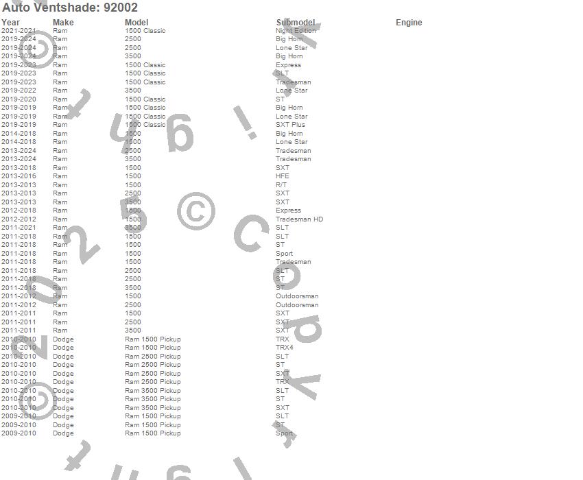 Below is an abbreviated list of applications for the Ventvisor Deflector 2 pc..1500, 1500 Classic, 2500, 3500, Ram 1500, Ram 2500, Ram 3500, Dodge, Ram, 2024, 2023, 2022, 2021, 2020, 2019, 2018, 2017, 2016, 2015, 2014