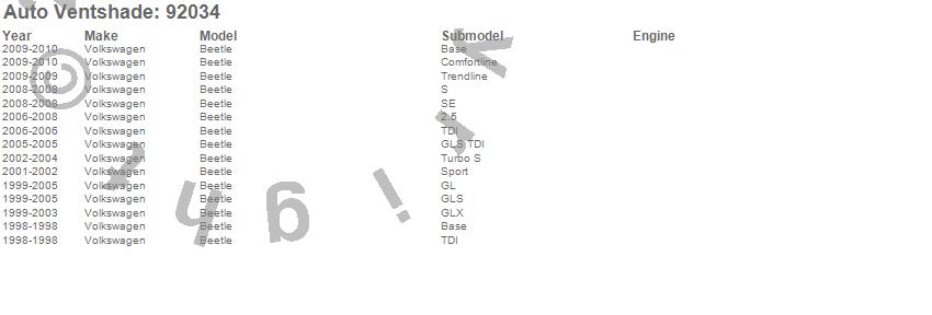 Below is an abbreviated list of applications for the Ventvisor Deflector 2 pc..Beetle, Volkswagen, 2010, 2009, 2008, 2007, 2006, 2005, 2004, 2003, 2002, 2001, 2000, 1999, 1998