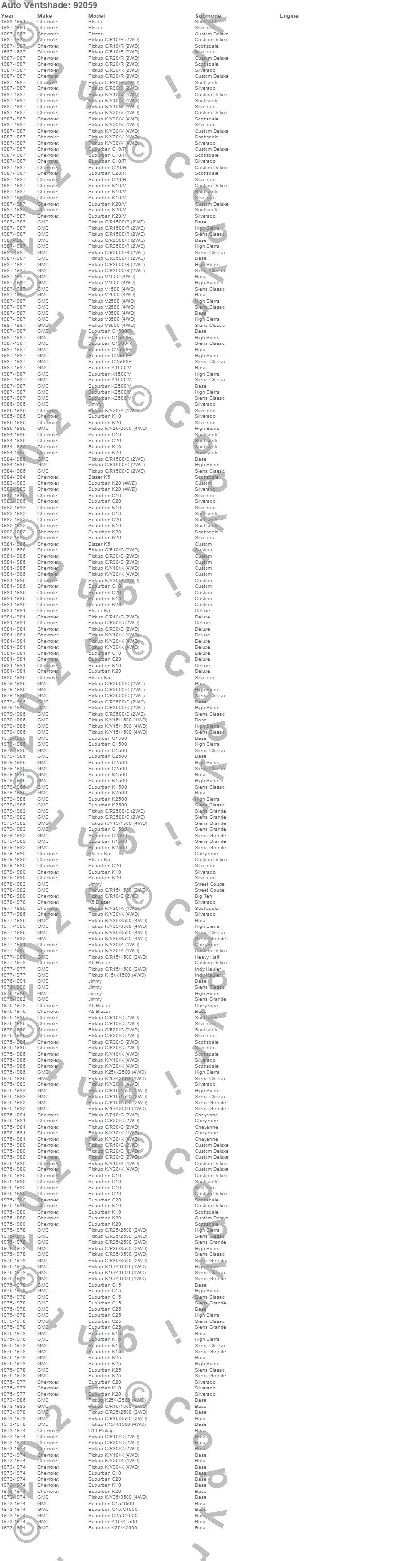 Below is an abbreviated list of applications for the Ventvisor Deflector 2 pc..Blazer, Blazer K5, C10 Pickup, C10 Suburban, C15 Suburban, C15/C1500 Suburban, C1500 Pickup, C1500 Suburban, C20 Pickup, C20 Suburban, C25 Suburban, C25/C2500 Pickup, C25/C2500 Suburban, C2500 Pickup, C2500 Suburban, C30 Pickup, C35/C3500 Pickup, C3500 Pickup, Jimmy, K10 Pickup