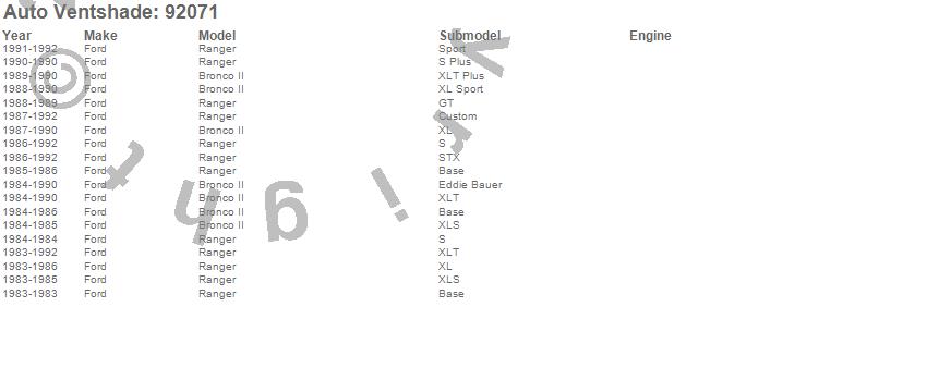 Below is an abbreviated list of applications for the Ventvisor Deflector 2 pc..Bronco II, Ranger, Ford, 1992, 1991, 1990, 1989, 1988, 1987, 1986, 1985, 1984, 1983
