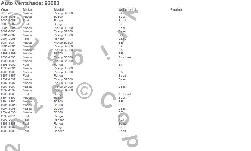 Below is an abbreviated list of applications for the Ventvisor In-Channel Deflector 2 pc..B2300, B3000, B4000, Ranger, Ford, Mazda, 2011, 2010, 2009, 2008, 2007, 2006, 2005, 2004, 2003, 2002, 2001, 2000, 1999, 1998