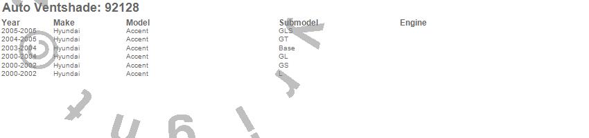 Below is an abbreviated list of applications for the Ventvisor Deflector 2 pc..Accent, Hyundai, 2005, 2004, 2003, 2002, 2001, 2000
