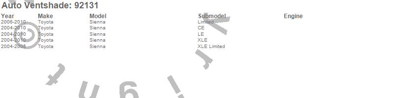 Below is an abbreviated list of applications for the Ventvisor Deflector 2 pc..Sienna, Toyota, 2010, 2009, 2008, 2007, 2006, 2005, 2004