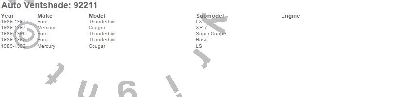 Below is an abbreviated list of applications for the Ventvisor Deflector 2 pc..Cougar, Thunderbird, Ford, Mercury, 1997, 1996, 1995, 1994, 1993, 1992, 1991, 1990, 1989