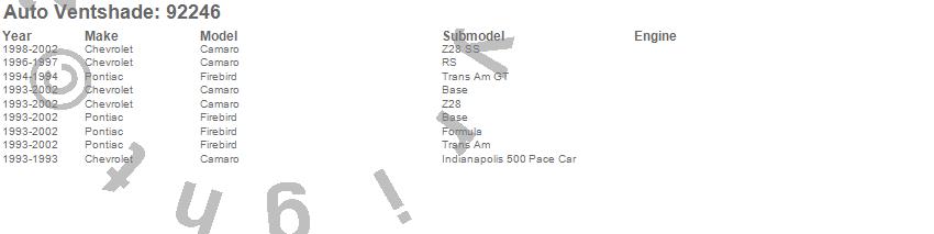 Below is an abbreviated list of applications for the Ventvisor Deflector 2 pc..Camaro, Firebird, Chevrolet, Pontiac, 2002, 2001, 2000, 1999, 1998, 1997, 1996, 1995, 1994, 1993