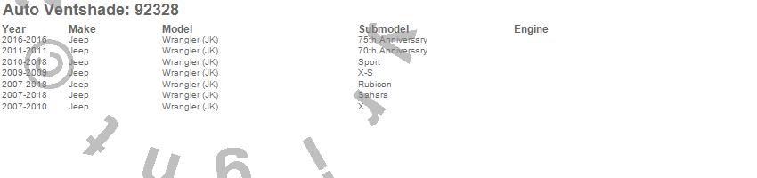 Below is an abbreviated list of applications for the Ventvisor Deflector 2 pc..Wrangler (JK), Jeep, 2018, 2017, 2016, 2015, 2014, 2013, 2012, 2011, 2010, 2009, 2008, 2007